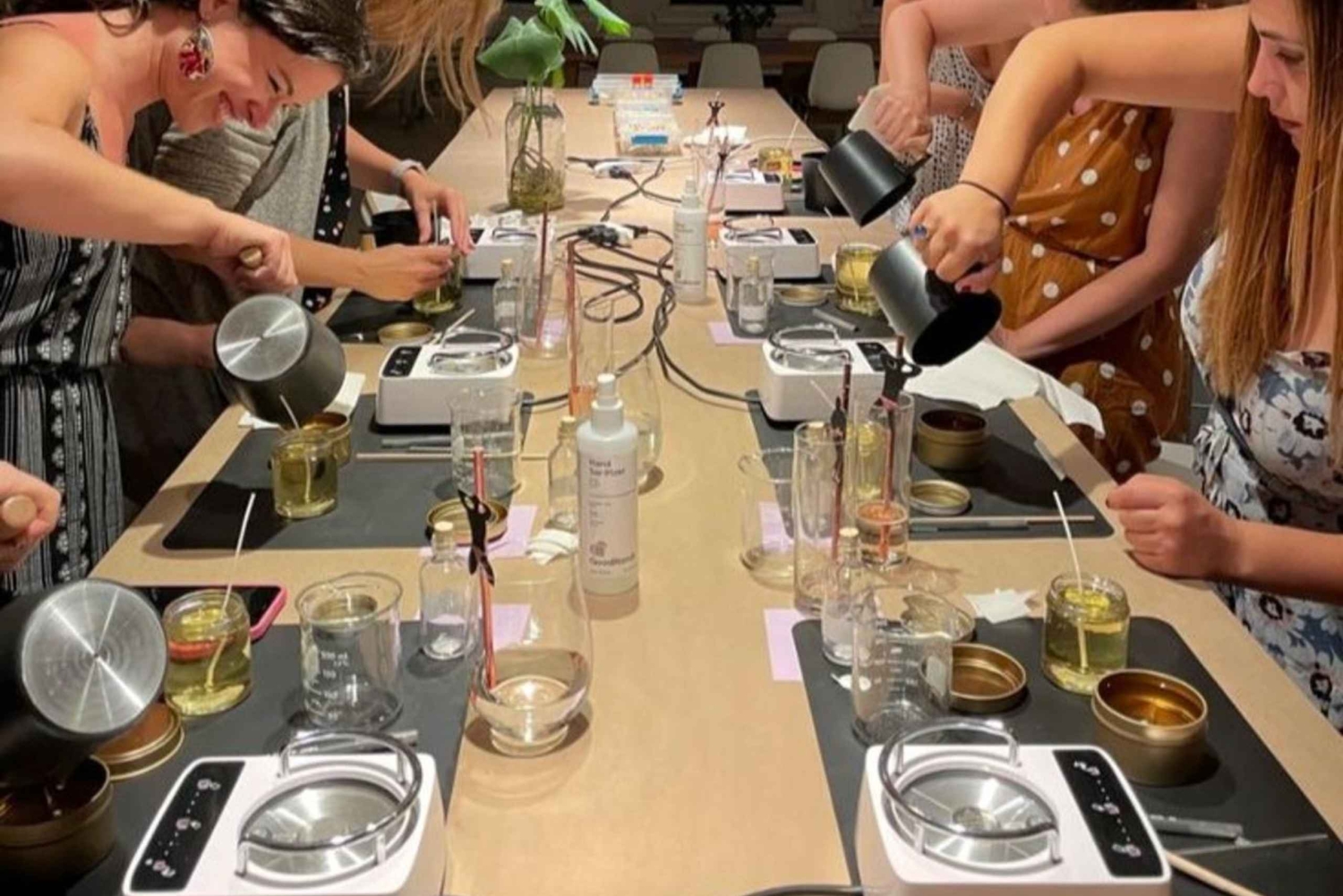 環境に優しい大豆ワックス、高級フレグランスオイル、乾燥植物のハーブや花を使って作業を進めていきます。溶かす作業や香りのブレンドから、装飾や注ぎまで、すべての工程をご案内いたします。